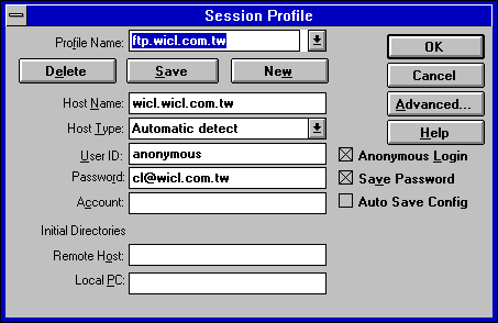 Username = ftp 或 anonymous Password = 本 身 的 E-mail Address, 如 cl@wicl.com.tw