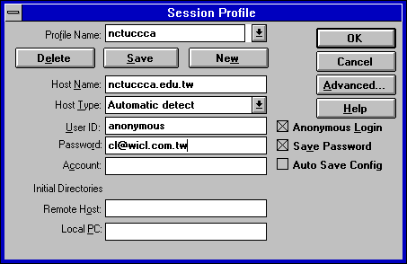 WS_FTP 內 建 已 有 多 個 Anonymous FTP Server 的 Profile Name 可 供 連 線 , 都 是 國 外 的 Anonymous FTP Server , 若 是 要 建 立 一 個 新 的 Profile Name , 如 台 灣 最 大 的 Anonymous FTP Server 是 交 大 的 nctuccca.edu.tw , 要 建 立 這 個 Profile name 以 供 連 線 選 擇 用 , 可 在 圖 一 出 現 時 按 一 下, 便 會 將 圖 一 中 各 輸 入 欄 清 為 空 白 , 這 時 首 先 輸 入 Profile Name = nctuccca , 接 著 將 圖 右 中 處 選 定 "anonymous Login" 及 "Save Password" , 接 著 輸 入 Host Name=nctuccca.edu.tw , UserID = anonymous , Password = 您 的 E-mail Address , 基 本 上 只 需 填 寫 至 此 即 可 , 然 後 按